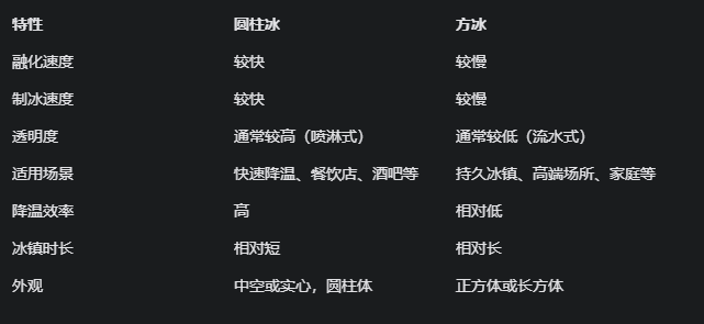 其實(shí),圓柱冰和方冰沒有誰好誰壞,就看你用在哪兒,需要啥樣的效果了。為了更直觀的展示,咱直接上表格:
