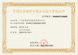 冰泉制冷又順利獲得了由中國(guó)設(shè)備管理協(xié)會(huì)聯(lián)合相關(guān)行業(yè)協(xié)會(huì)頒發(fā)的中國(guó)設(shè)備維修安裝企業(yè)能力等級(jí)證書(建筑機(jī)電類)。