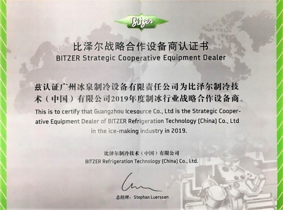 近日,比澤爾制冷技術(shù)(中國(guó))有限公司,授予廣州冰泉制冷設(shè)備有限責(zé)任公司(CBFI)“2019年比澤爾戰(zhàn)略合作設(shè)備商認(rèn)證書”,廣州冰泉制冷成為比澤爾在中國(guó)制冰行業(yè)唯一一家戰(zhàn)略合作設(shè)備商。通過強(qiáng)強(qiáng)聯(lián)合,廣州冰泉制冷(CBFI)能為客戶提供更好的產(chǎn)品和服務(wù)。